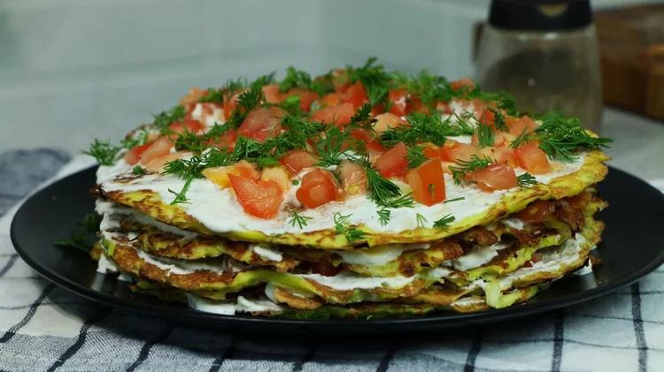Збираємо капустяний торт. Кожен млинець змащуємо соусом, а зверху розподіляємо нарізаний помідор. Збираємо торт доки не закінчаться всі інгредієнти.