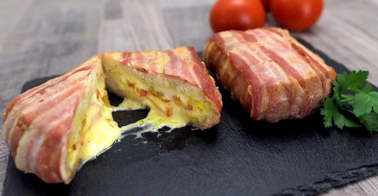 Беремо ще три шматочки бекону та покриваємо пробіли.