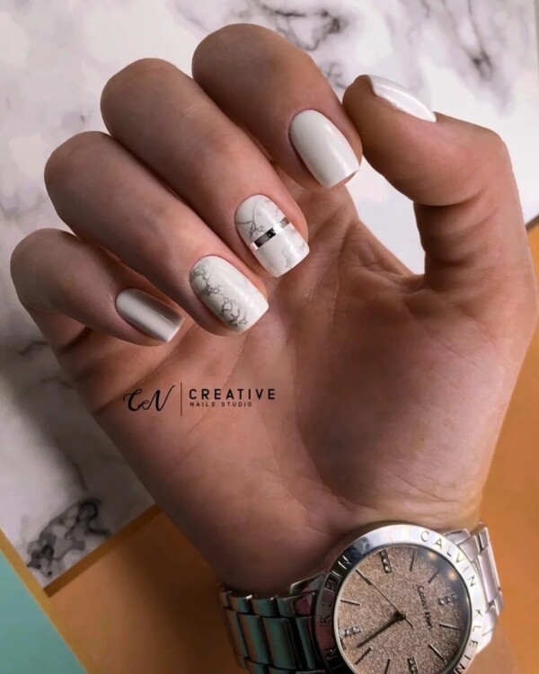 Мармуровий дизайн для строгого манікюру на коротких нігтях