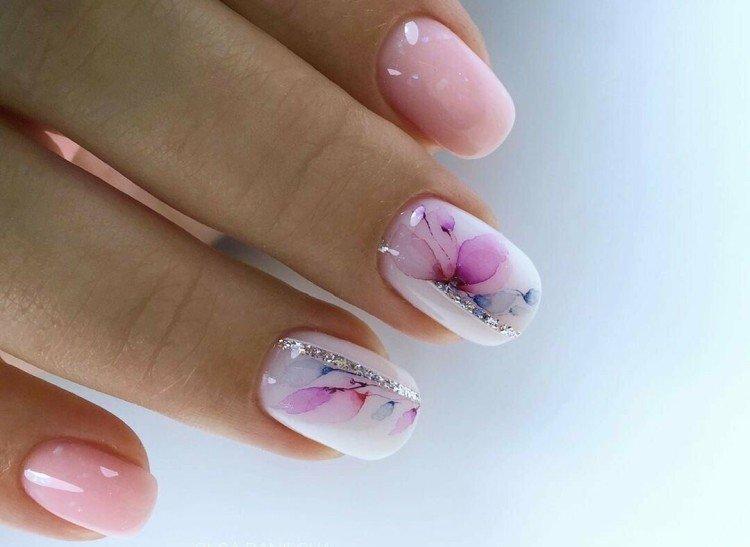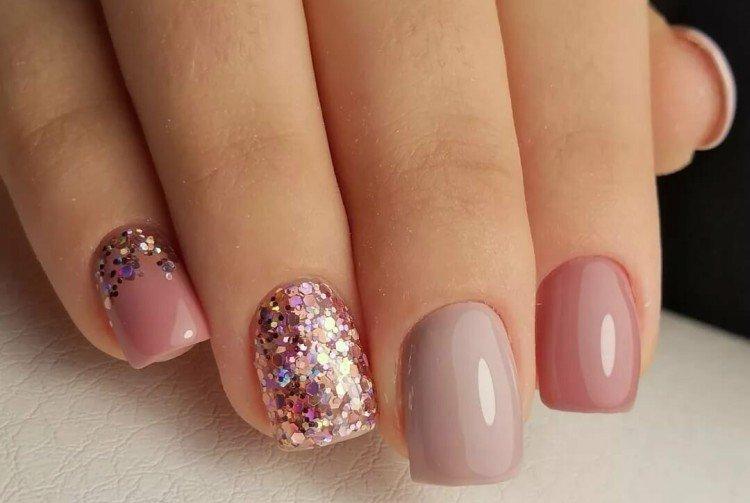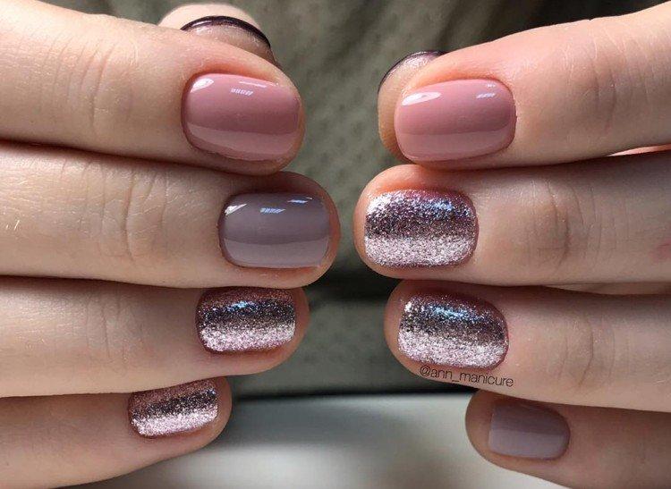 Для ніжного манікюру з блискітками зверніть увагу на дрібний срібний, золотий, попелястий або рожевий гліттер. Дивовижно виглядають розтяжки та місячний манікюр за їх допомогою.