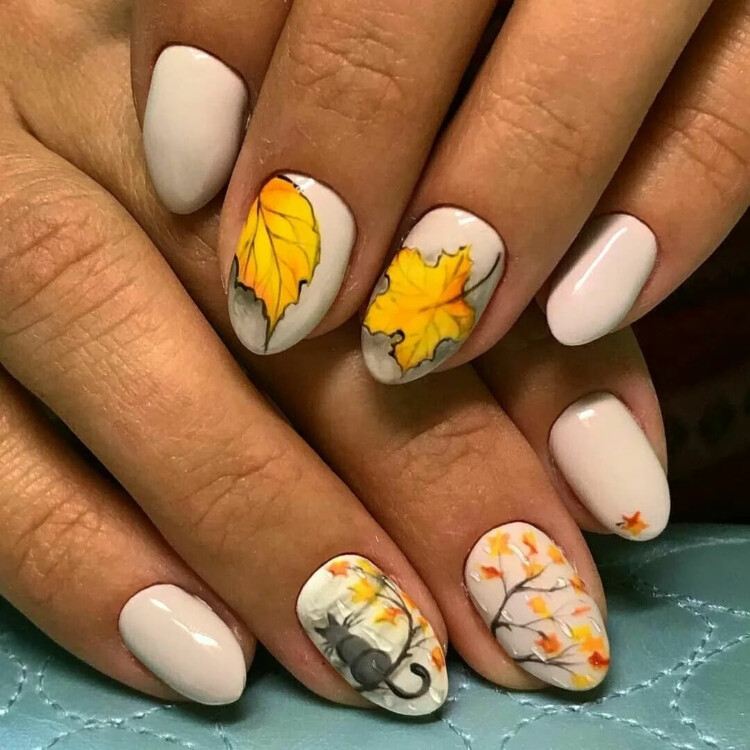 Не варто забувати про художній розпис у вигляді “золотої осені”, яка додасть образу неповторності і витонченості. У такому варіанті може бути застосована фольга золотого кольору. Вона чудово поєднується з будь-яким відтінком, надаючи особливу атмосферу для образу.