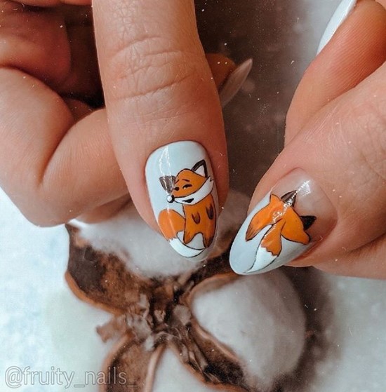 Хитра лисичка може стати головним акцентом в манікюрі. Якщо ви хочете ніжний дизайн, то краще за все зобразити мордочку тварини в приглушених кольорах. Причому лисичку краще малювати на одному нігті, а інші пальчики залишити в однотонному оформленні.