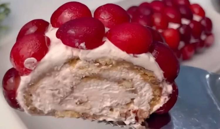Виймаємо із плівки і змащуємо відкладеним кремом. Прикрашаємо ягодами вишні та прибираємо в морозилку ще на одну годину.