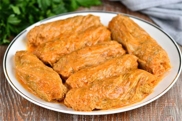 Рулетики із капусти заливаємо соусом. Накриваємо кришкою, доводимо до кипіння і тушкуємо рулетики на слабкому вогні 30 хвилин. За цей час листя і фарш стануть ніжними.