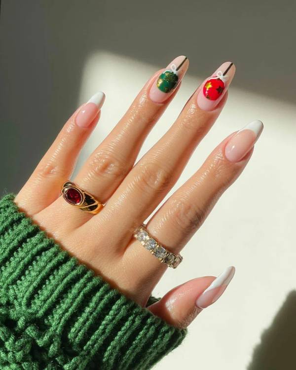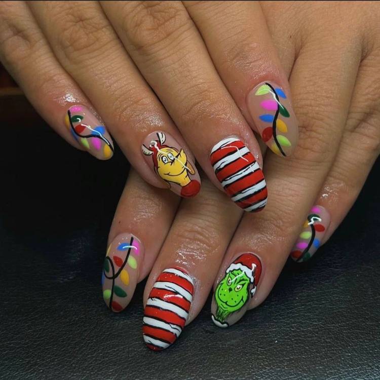 Тим, хто все ж таки не готовий до яскравого нейл-арту радимо вибирати прості дизайни. Наприклад, мінімалістичні малюнки на прозорій чи нюдовій базі. Це можуть бути невеликі сніжинки і зірочки – причому зовсім не обов’язково розташовувати малюнок на кожному нігті: можна тільки на одному або двох як акцент. Якщо все ж таки зважилися на яскравий дизайн – не обмежуйте свою фантазію: ялинка, іграшки, гірлянди, льодяники та пряникові чоловічки – все має право на життя у вашому манікюрі. Навіть герої улюблених новорічних фільмів та мультиків (від Кевіна з “Один дома” до Грінча) – головне, знайти майстра, який зможе виконати такий складний нейл-арт. Все ще вагаєтесь? Спеціально для вас ми зібрали різні новорічні дизайни.