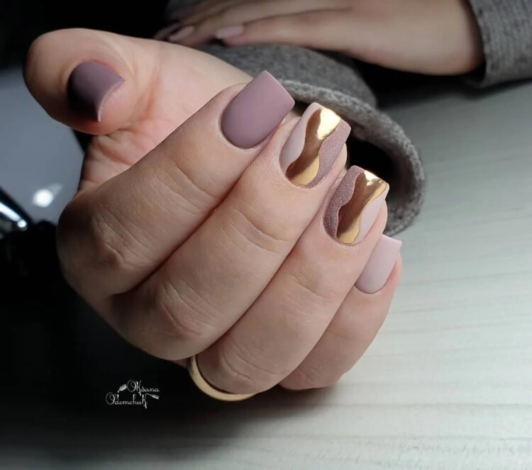 Золоті мотиви чудово виглядають і в рожевому матовому манікюрі, роблячи ручки жінки більш доглянутими і статусними.