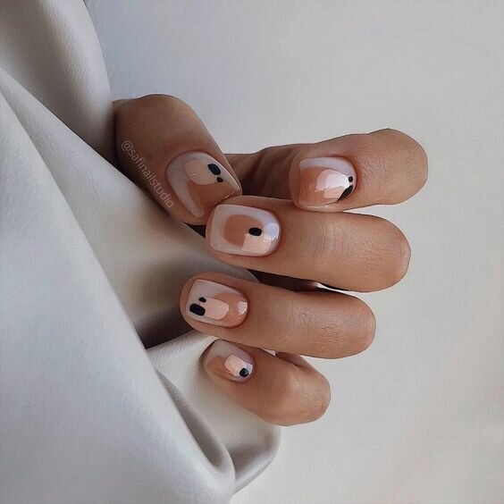 До ніжного дизайну до бежевій основі ідеально підійдуть малюнки на рослинну тему: витончені бутони і тонкі гілочки на нюдовому тлі. Щоб манікюр виглядав цікаво, для малюнка використовуйте контрастні кольори: чорний або білий.