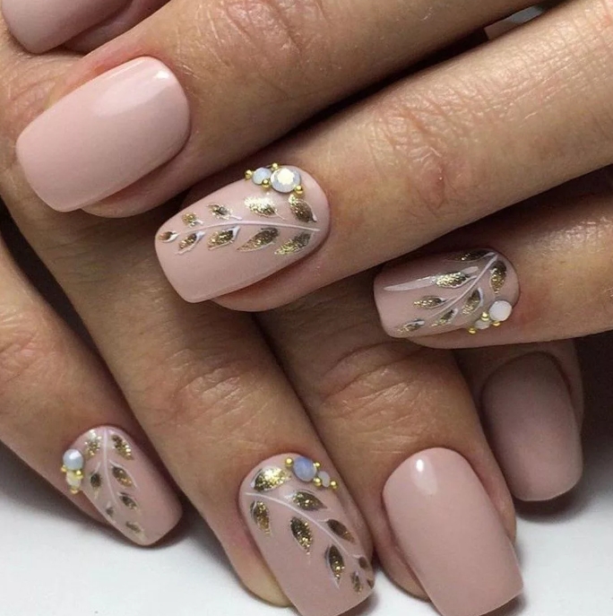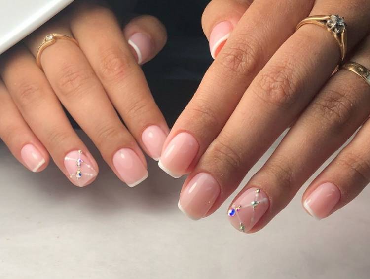 Стримана ніжна палітра відтінків у поєднанні з блискітками та стразами дозволяє створити неймовірний манікюр. Дуже цікаво виглядає абрикосовий гель-лак зі стразами. Елегантно і жіночно виглядатиме тандем із рожевим топом. Милим буде манікюр в ірисовому кольорі.
