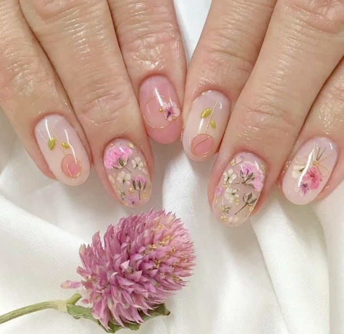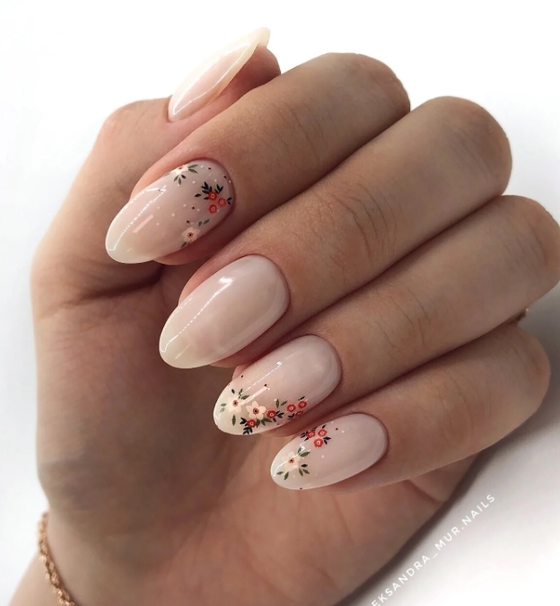 У топ найкращих ідей входить ніжний манікюр із польовими квітами. Тут попит має пастельна палітра. Спробуйте покрити всі нігті гіацинтовим кольором, а безіменний зробити білим і нанести на нього волошки. Також у тренді всіма улюблені троянди. Ці кольори завжди виглядають по-королівськи та шикарно. Милий дизайн можна створити за допомогою ромашок. Їх обирають дівчата-загадки чи творчі натури.