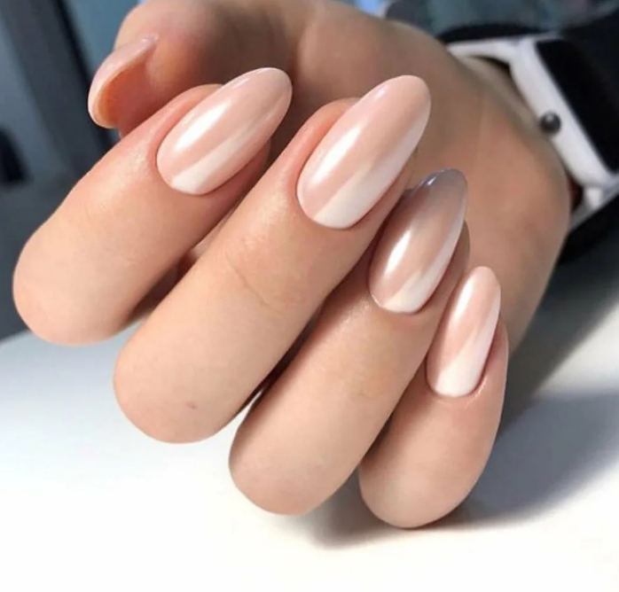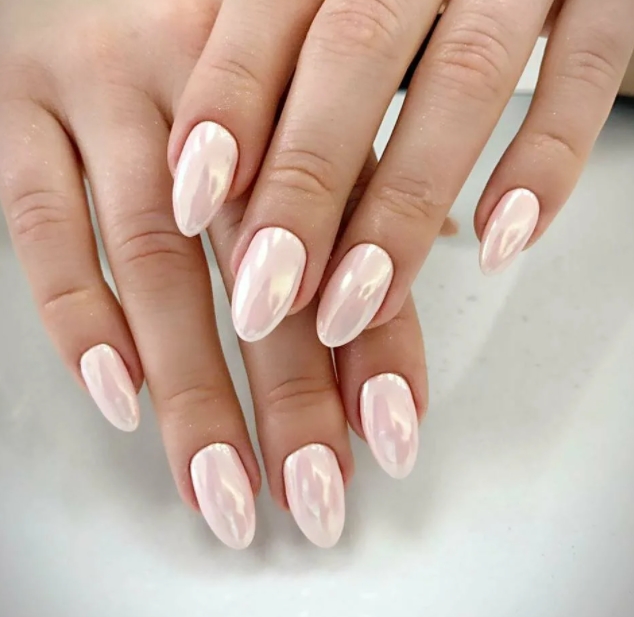 Завдяки цьому прийому ніжний базовий тон набуває загадкового сяйва. Для створення такого ефекту майстри зазвичай використовують перлинне або голографічне втирання. Такий варіант урізноманітнить повсякденний образ і добре підійде до вбрання на вечірку.