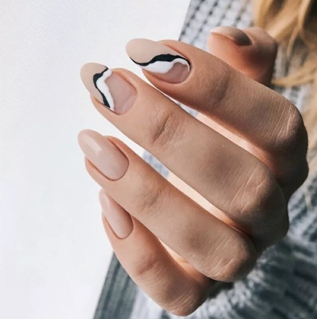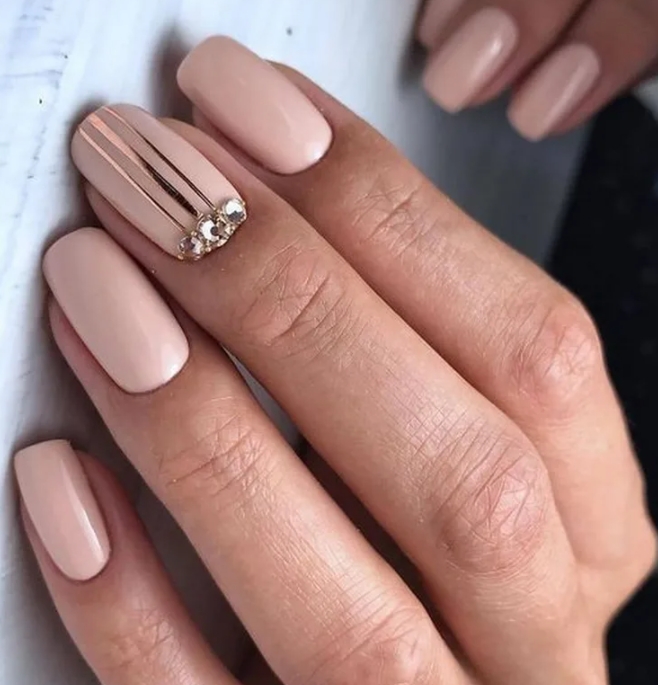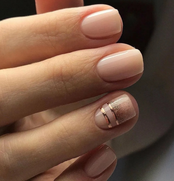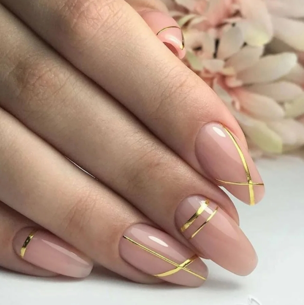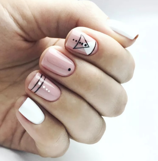 На думку досвідчених майстрів манікюру, геометрія та нюдові тони ідеально доповнюють один одного. Сьогодні в тренді візерунки, виконані гель-фарбою «павутинка». Ефект свята у дизайн можна внести помірним додаванням блискіток.