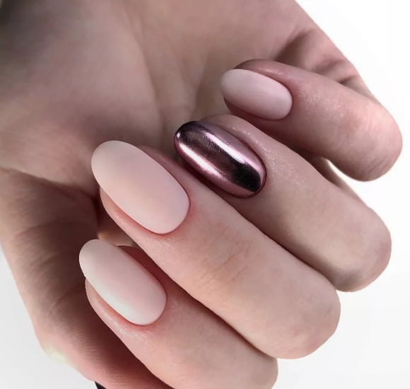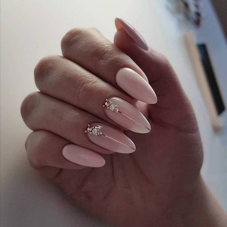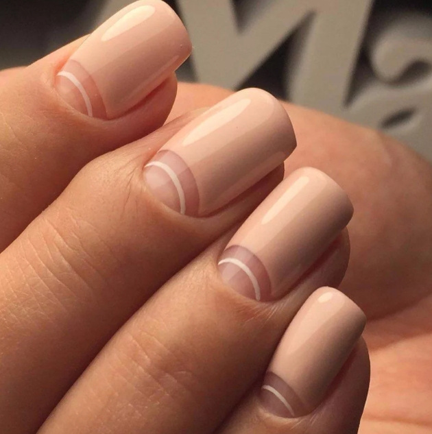 Такий дизайн сприяє візуальному подовженню пальців та створенню витонченого образу. Як основу використовують відтінки рожевого, бузкового, кавового, молочного чи попелястого.