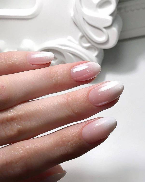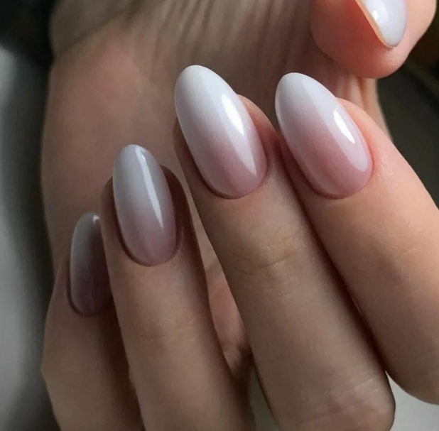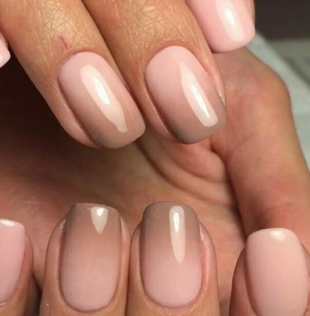 Так називають плавний перехід одного кольору до іншого. Щоб дотриматися канонів нюдового дизайну, майстру варто взяти лаки у відповідній колірній гамі, причому один тон буде трохи світлішим. Темніший відтінок наноситься на пластину ближче до основи, а світлий – на кінець нігтя. Потім між кольорами робиться перехід. Несподіваний ефект утворюється при використанні зворотного поєднання кольорів.