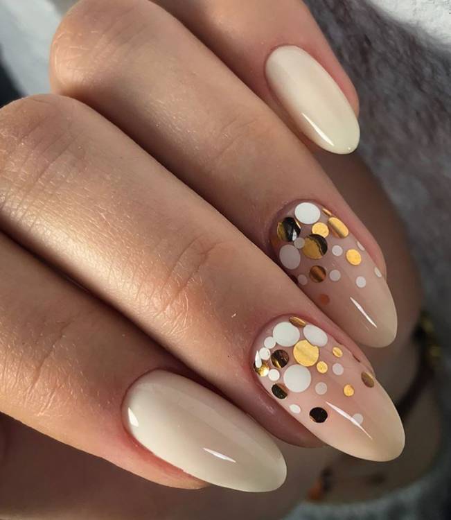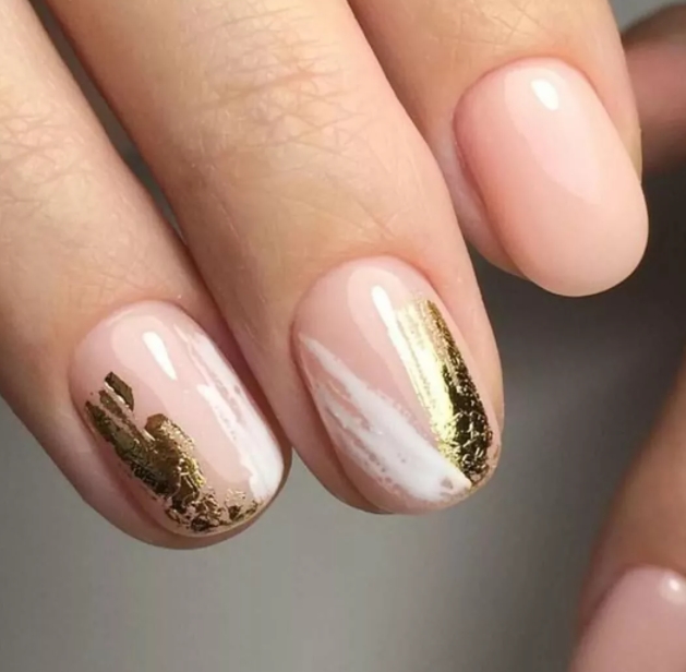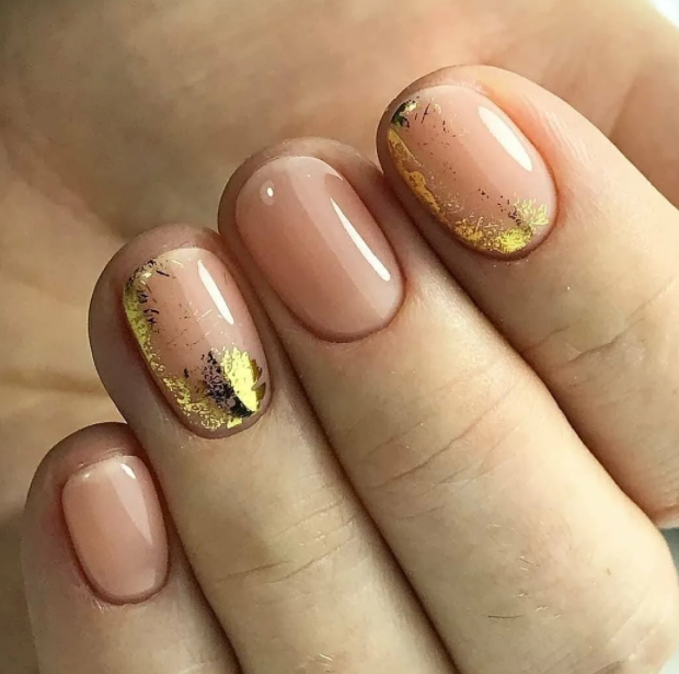 Золотистий декор на нейтральному тлі виглядає дуже органічно та ефектно. Для оформлення нігтів можна використовувати: