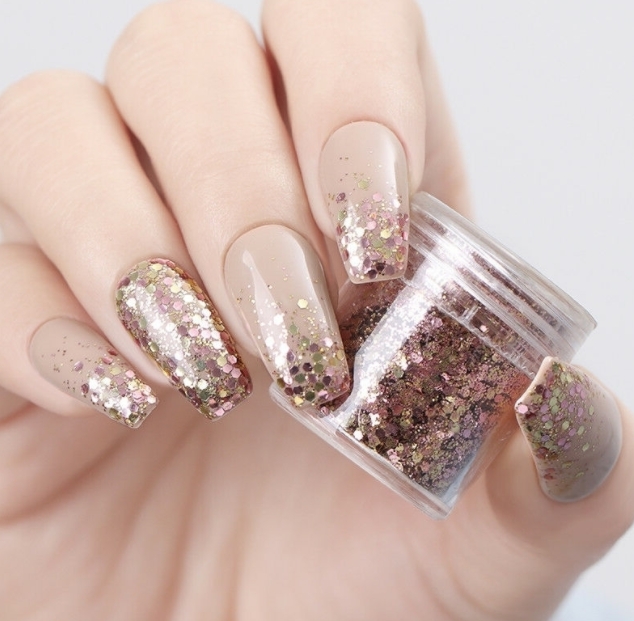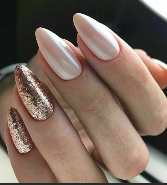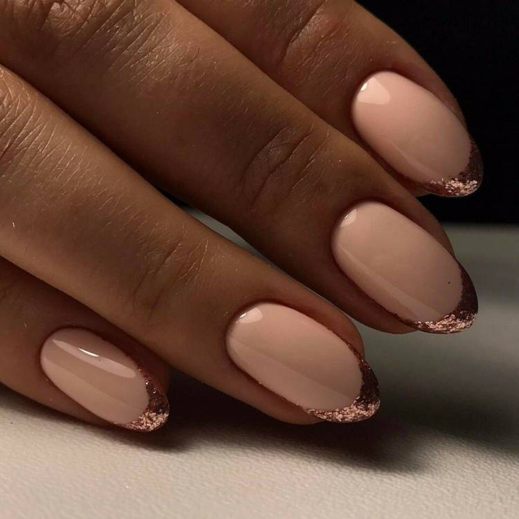 Цей варіант найбільше підходить для вечірніх образів. Для створення базовий тон доповнюють гліттером. Причому блискуча зона займає край нігтя, а перехід до неї виконується як градієнт. В результаті нігті виглядають ніжно, таємниче, ошатно і блискуче.