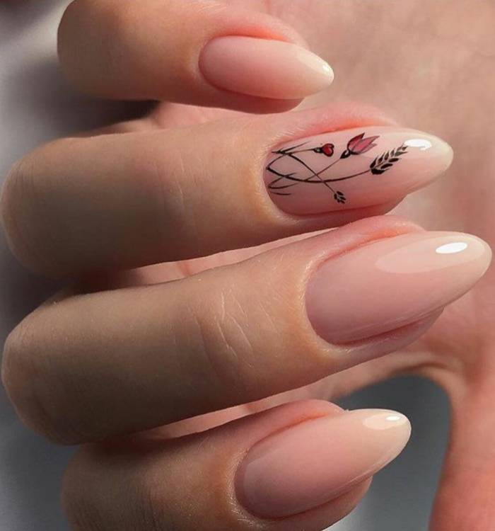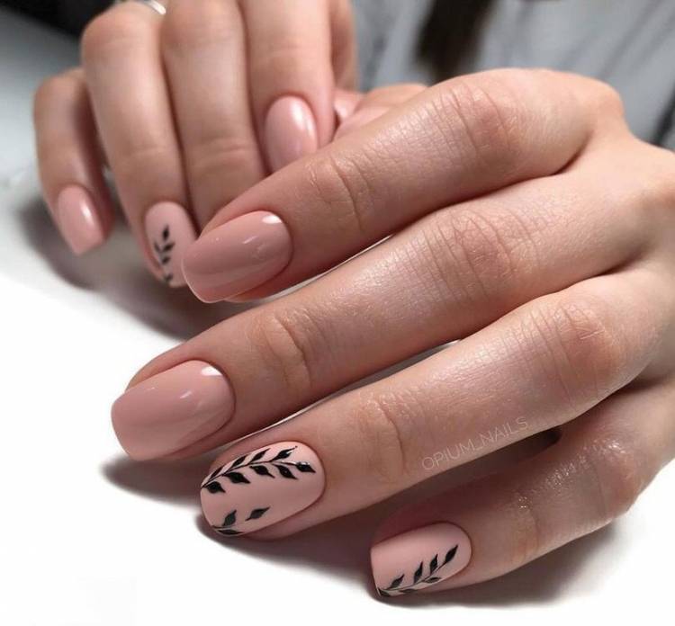 Щоб зберегти спокій та умиротворення нюдового манікюру, іноді принти виконують у напівпрозорому вигляді. Для романтичного образу дозволяється малювати квіти у темних тонах, що виглядатиме таємниче та незвичайно.