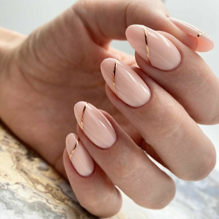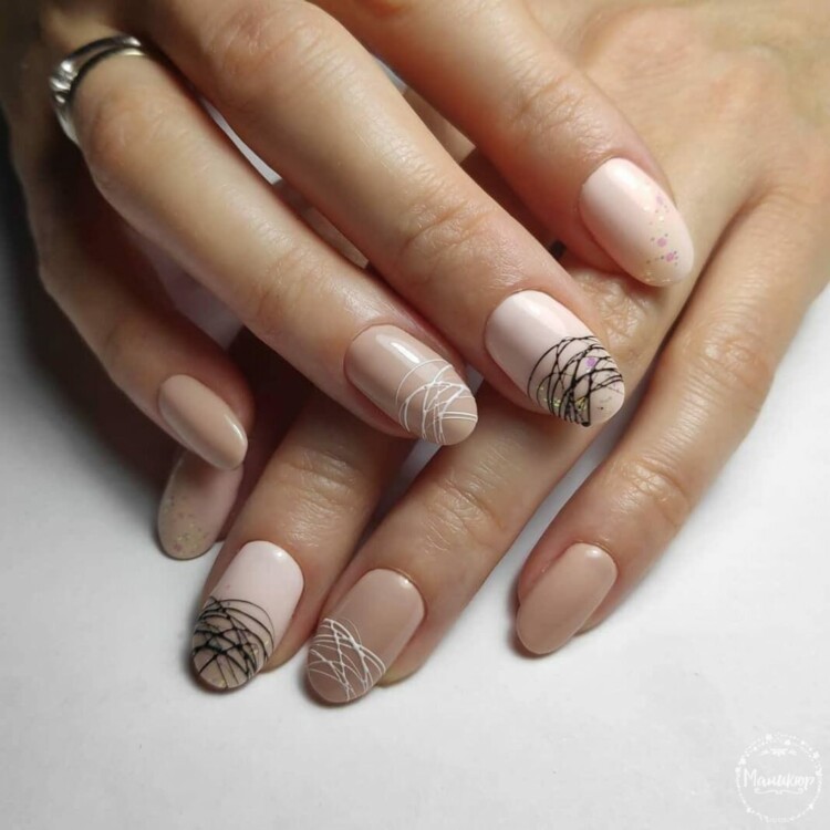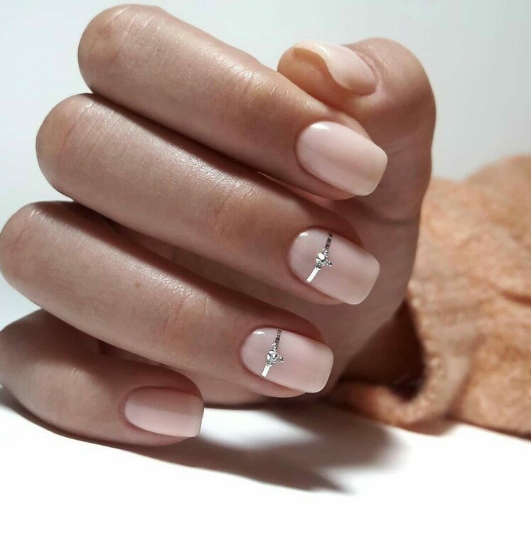 Нюдовий відтінок ідеально виглядає при виконанні геометрії. Чіткі лінії надають самодостатність і лаконічність образу. Також можна зробити особливу комбінацію з декількох відтінків нюда. Втірка надає такому манікюру трохи яскравості і акценту на деякі елементи манікюру.