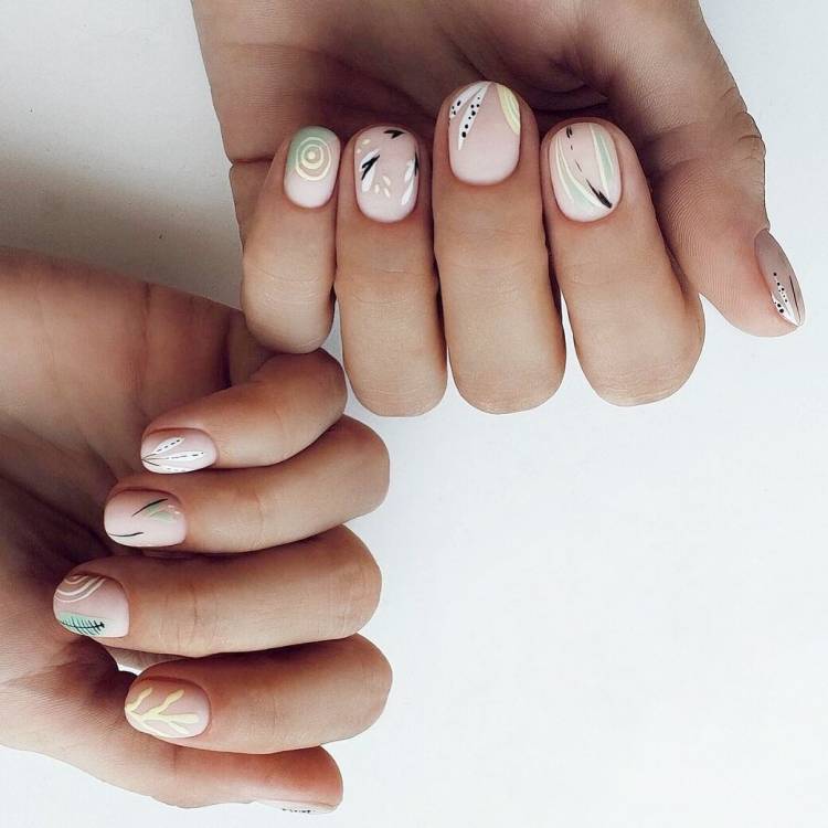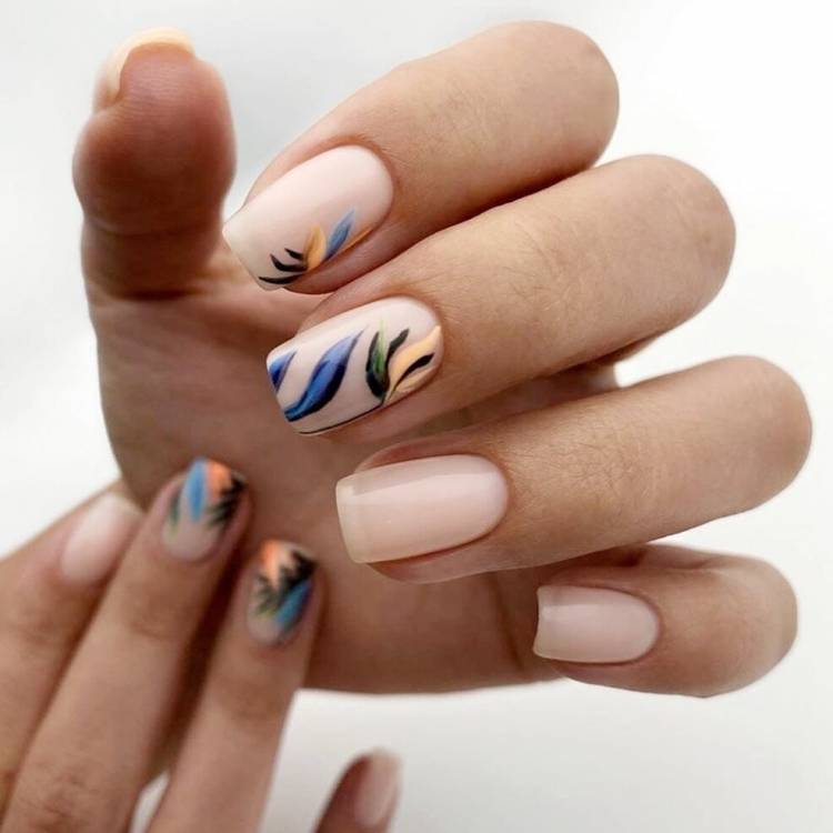 Бежеві нігтики самі по собі є базовим і строгим варіантом манікюру, тому якщо ви бажаєте злегка урізноманітнити світле покриття, сміливо прикрашайте нюдові нігті тематичними візерунками, яскравою абстракцією або малюнками в техніці стемпінг-дизайн. Для ефектних елементів на бежевій основі підійдуть актуальні в новому сезоні відтінки лаків: помаранчеві, зелені, червоні, яскраво-рожеві, ягідні і жовті тони.