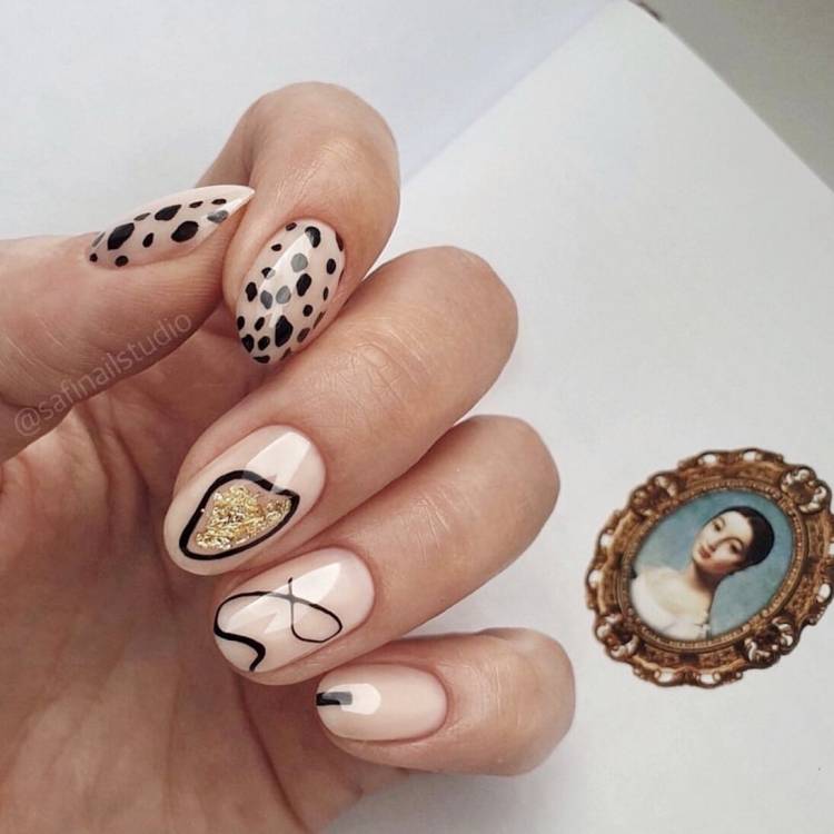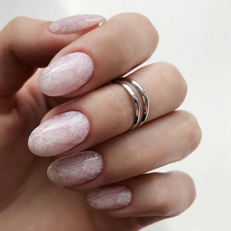 Красивим і ефектним рішенням для модного манікюру в стилі nude виявиться акцент на одному нігті або парочка яскравих візерунків на декількох нігтиках. Для такого дизайну топові майстри використовують як ручний розпис, так і оригінальні малюнки за допомогою стемпинг-техніки, що перетворює нудний бежевий манікюр в оригінальний і вишуканий.