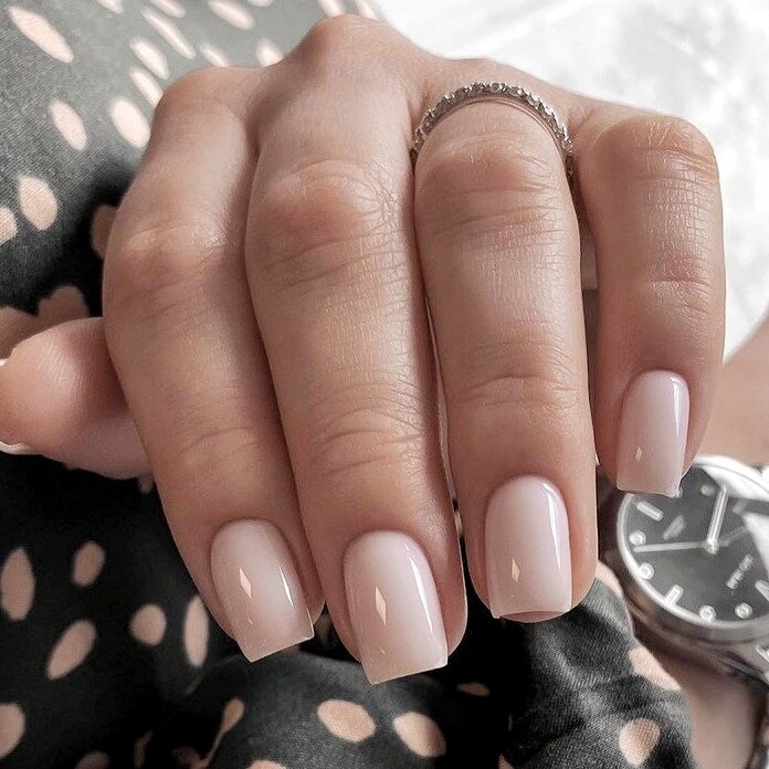 Як і раніше популярний простий і універсальний вид нюдового манікюру – однотонне покриття з будь-яким топом, матовим або глянсовим. Стриманий манікюр в бежевих відтінках буде виглядати максимально дорого і привабливо, якщо в якості декору додати трохи блискіток або фольги, як наприклад, в варіантах з сяючим акцентом на кінчиках нігтів або в нюдовому манікюрі з лунками. При бажанні, ви можете залишити лаконічний бежевий дизайн без акцентів, але обов’язково врахуйте той факт, що однотонний матовий фініш – самий мазкий вид манікюру, за яким потрібно буде стежити.