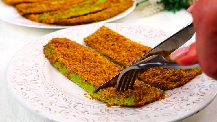 Кожну смужку кабачка змащуємо рослинною олією з двох сторін, обмочуємо в паніровці.