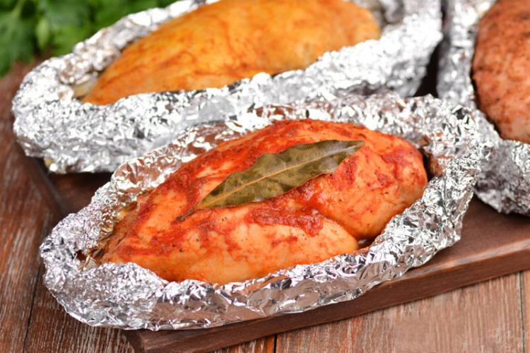 Філе грудки щільно загортаємо у фольгу, перекладаємо у форму та відправляємо у розігріту духовку при 200 градусах на 30 хвилин. За рахунок того, що філе запікатиметься у власному соку, воно вийде дуже ніжне і соковите.