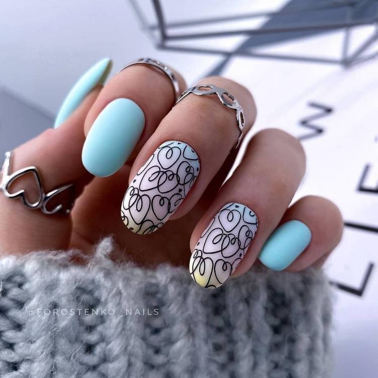Квітковий орнамент, як і геометрію, можна поєднувати з різними видами манікюру. Найпопулярніший варіант зробити з його допомогою акцент на двох або чотирьох нігтях.