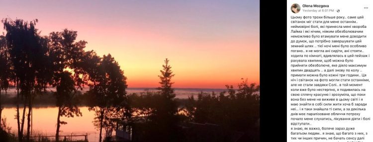 У своєму фейсбуці українська продюсерка Олена Мозгова, пригадала, як сильно страждала від хвороби Лайма. Її мучили нестерпні болі й параліч м’язів. Знеболювальне допомагало лише на короткий час, а вживати його не можна було часто.