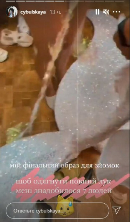 “Мій фінальний образ для зйомок. Щоб одягнути повний лук, мені сім людей допомагали. Реагуйте, якщо мені личить” – написала Ольга.