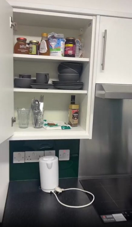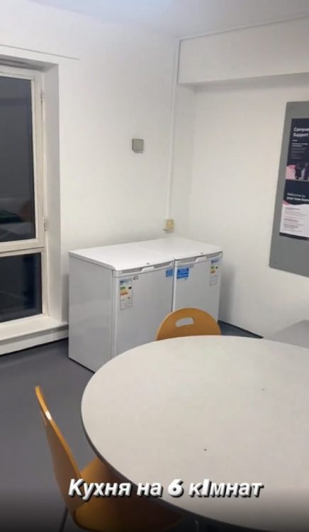 Кухня для студентів розрахована на шість кімнат. У ній є два холодильники, плита, духовка та все необхідне для комфортного життя.