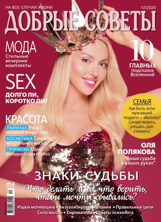 Оля Полякова з’явилася на обкладинці новорічного випуску журналу “Добрые советы”, присвяченого знакам долі. В інтерв’ю Королева Ночі прямолінійно висловилася на тему астрологів і ворожок й поділилась враженнями від зйомок у шоу “Маска”, яке вже скоро стартує на каналі “Україна”. Повідомляє «РБК-Україна».