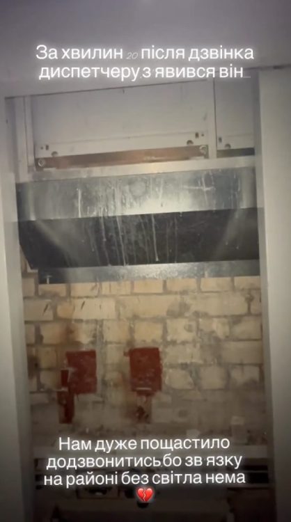 “У нашому ліфті стоїть тільки стілець, на який можна сісти. Але немає памперса, немає їжі та води. Добре, що у мене з собою є powerbank, книжка, яку я читаю, і спідниця, яку я сьогодні купила” – розповіла виконавиця.