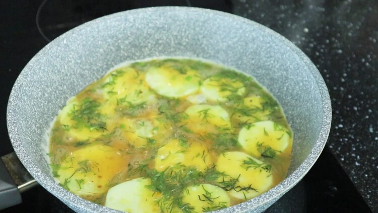 Виливаємо яєчну суміш. Накриваємо кришку і готуємо на повільному вогні до готовності. Я омлет спробувала перевернути, він у мене пошкодився, можна і не перевертати.