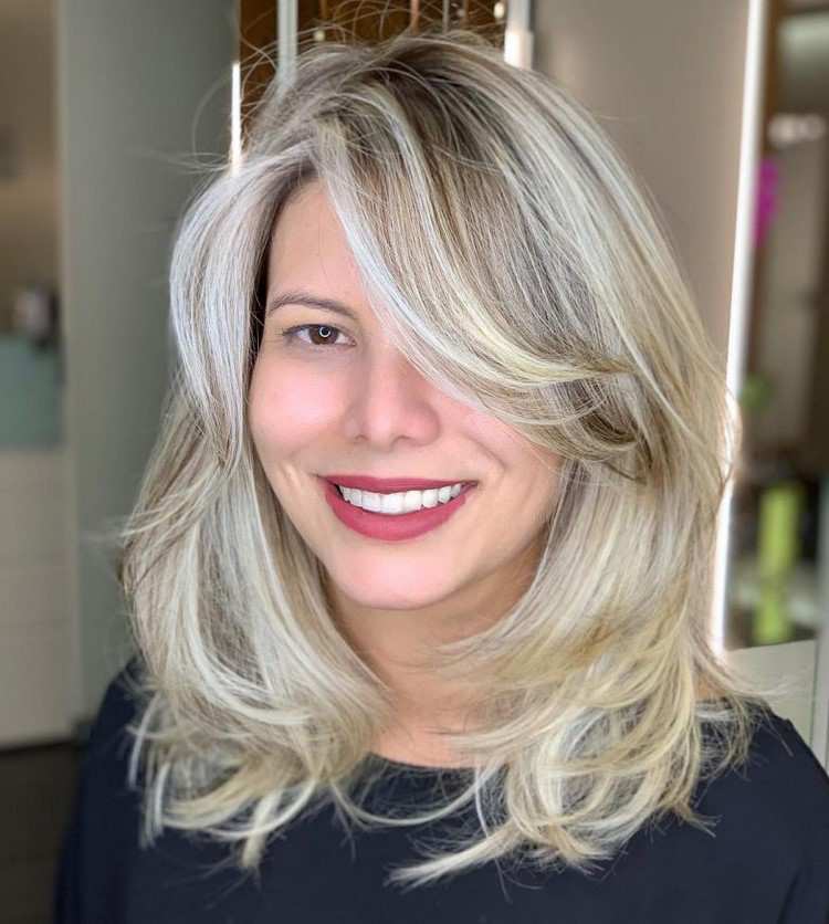 Шаруватий каскад з чубчиком 2023 — чудова ідея для жінок за 40. Ця стрижка створює об’єм і рух пасм, а чубок допомагає приховати зморшки на лобі.