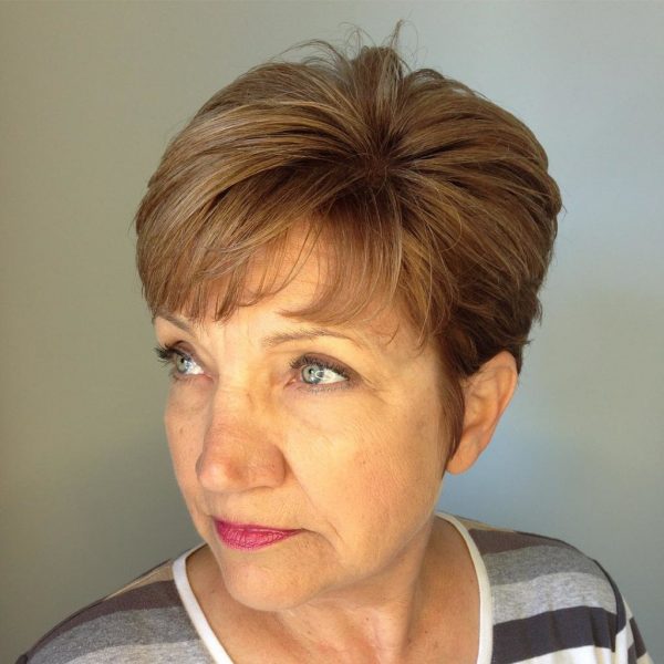 Прекрасний фінальний штрих до модної зачіски може привнести полегшену версію чубчика, який закінчується на рівні очей. Подібне оформлення передніх пасм зробить погляд виразнішим і глибшим, а також відверне увагу від вікових обмежень.