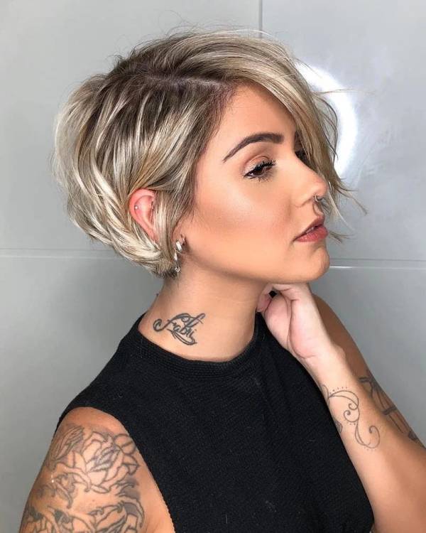 Ось такий зухвалий “боб” з подовженим чубчиком з укороченою потилицею зробить зовнішність цікавою, привабливою, романтичною та елегантною. Для цієї моделі стрижки найкраще підходить косий чубчик на подовження.