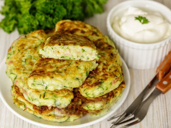 Відіжміть натертий кабачок. Вбийте яйце, посоліть і поперчіть до смаку. Всипте борошно і розмішайте. А для начинки натріть і з’єднати сир з шинкою.