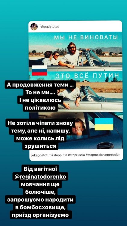 Катерина Осадча заявила, що даної теми більше не хотіла торкатися, адже, всі українські зірки безрезультатно намагаються достукатися до знаменитостей, які в цій страшній війні вирішили зберігати нейтралітет. Проте, вирішила таки спробувати “розтопити лід” і позначила в сторіс обліковий запис вагітної Регіни Тодоренко.