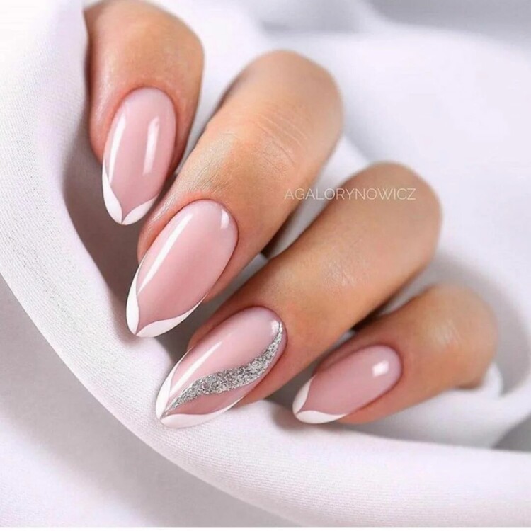 Найбільш популярною технікою манікюру для офісу вважається френч. Дійсно, півмісяць на кінчику нігтя виглядає дуже елегантно, жіночно і доглянуто. Однак не сильно святково. Саме тому в дизайн з френчем слід додати стрази або глітер, щоб зробити нейл-арт більш яскравим.