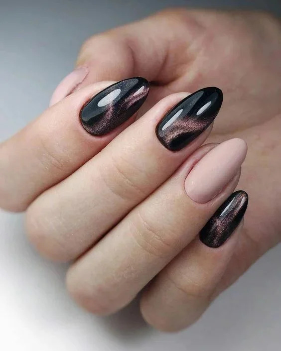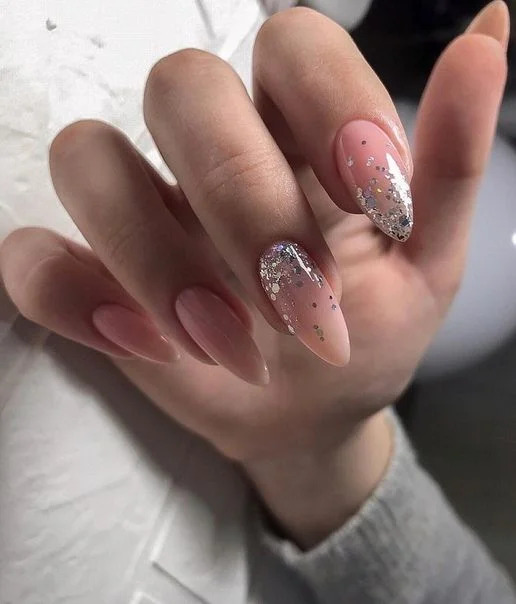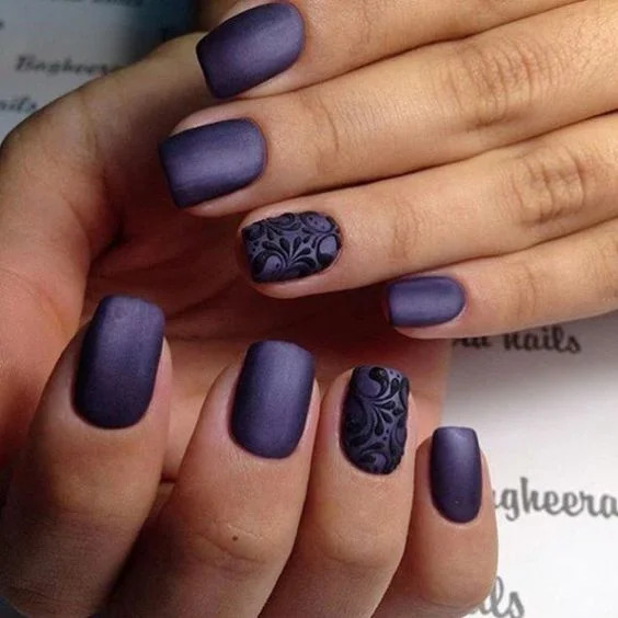 Матовий манікюр з фольгою виглядає дуже ефектно і елегантно. Щоб не переборщити з блискітками, декорують ними один-два пальця.