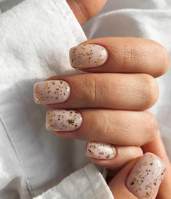 Матовий манікюр з фольгою виглядає дуже ефектно і елегантно. Щоб не переборщити з блискітками, декорують ними один-два пальця.