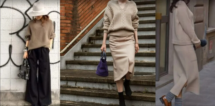 На другому фото також цікава добірка образів. Речі трохи вільні, але це ніяк не надає їм громіздкість. З трьох образів мені шалено сподобався середній. Не думала, що в’язаний светр буде так доречно виглядати зі спідницею. При цьому, кожен образ залишається елегантним.