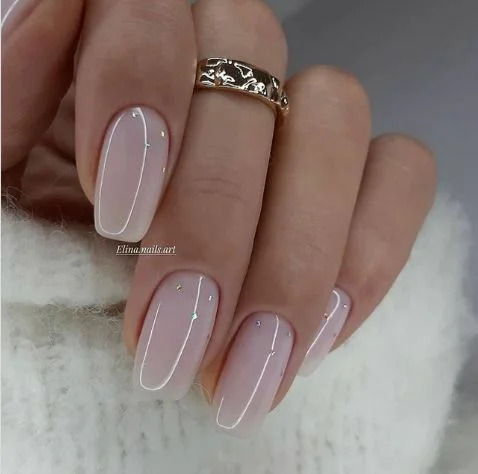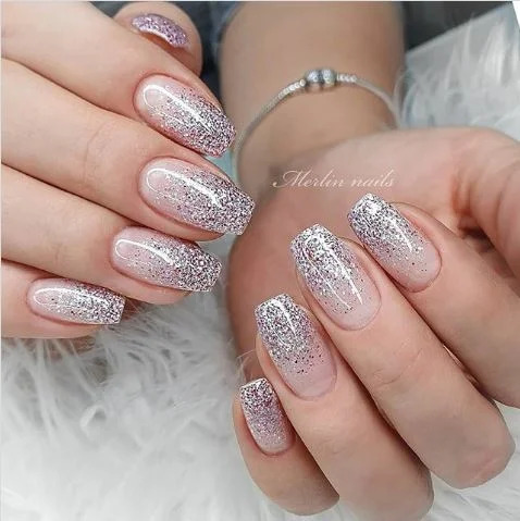 Ошатний, блискучий і делікатний дизайн нігтів пропонують профі-майстри, взявши за основу модний нюдовий манікюр і доповнивши його глітером у вигляді градієнтної розтяжки. Виглядає ніжно і інтригуюче одночасно. З таким чудовим нюдовим манікюром можна сміливо відправитися на вечірку або важливу урочисту подію, демонструючи відмінний смак.