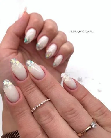 Оригінальним варіантом стане градієнт у вигляді голографічної втірки на кінчиках нігтів з нюдовим покриттям. Виглядає такий манікюр дуже стильно.