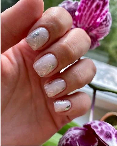 Тренди манікюру 2020-2021 пропонують поєднувати нюдове покриття на нігтях з сріблястим і золотим декором.