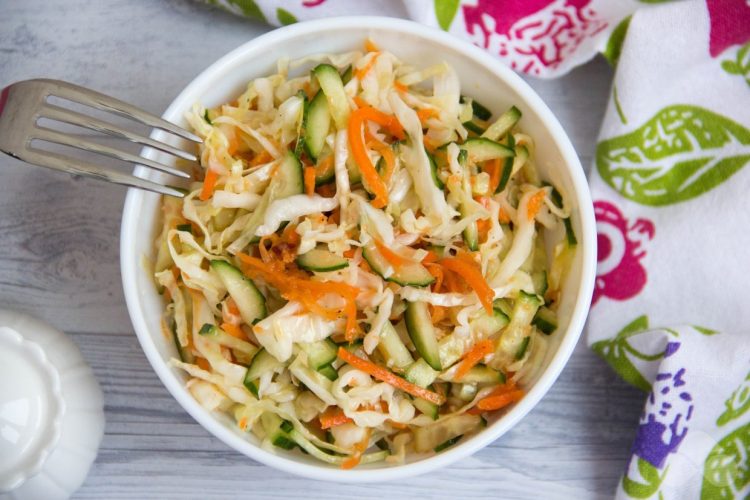 Капусту нарізаємо тонкою соломкою. Огірки нарізаємо невеликими кубиками. Змішуємо нарізану капусту та огірки. Додаємо молотий перець, сіль, рослинну олію та лимонний сік. Перемішуємо і залишаємо на 10-15 хвилин. Додаємо корейську моркву і ще раз перемішуємо. Перед подачею салат повинен настояти кілька годин в холодильнику.