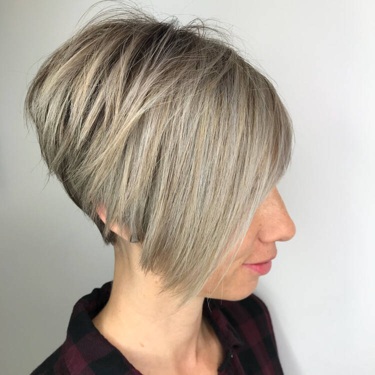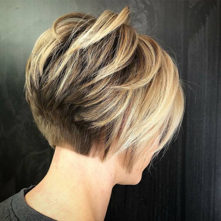 Полу-боб або напів-Пікс з рівним зрізом по низу потилиці і тонкими шарами зверху виглядає стильно і об’ємно. Доповніть стрижку акцентним фарбуванням, щоб додати глибину і насиченість кольору волосся.