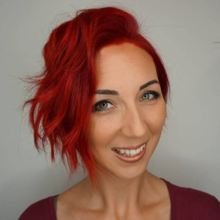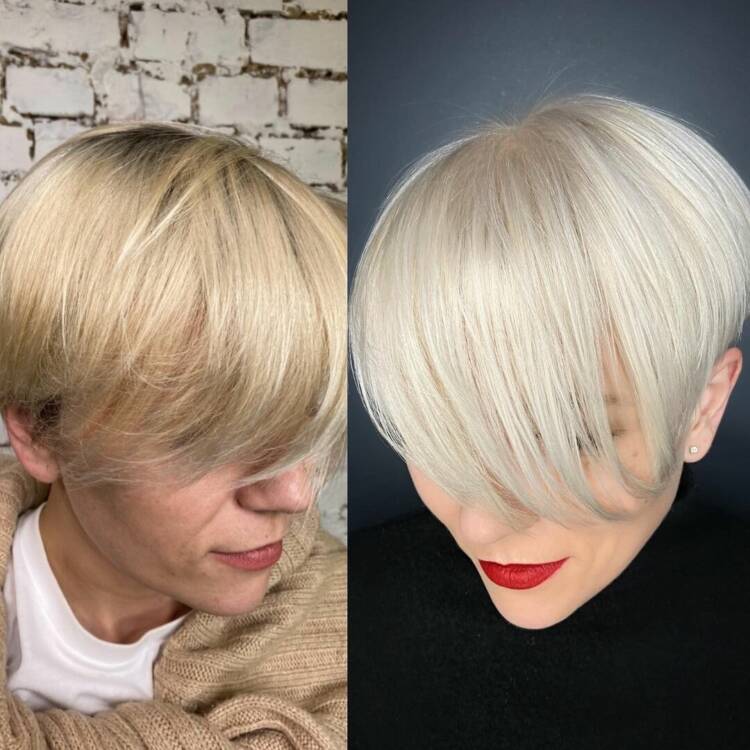 Ще один варіант сміливої короткої стрижки з асиметричним чубчиком. Завдяки невидимим шарам на потилиці стрижка виглядає дуже об’ємною, а фарбування доповнює цей ефект.