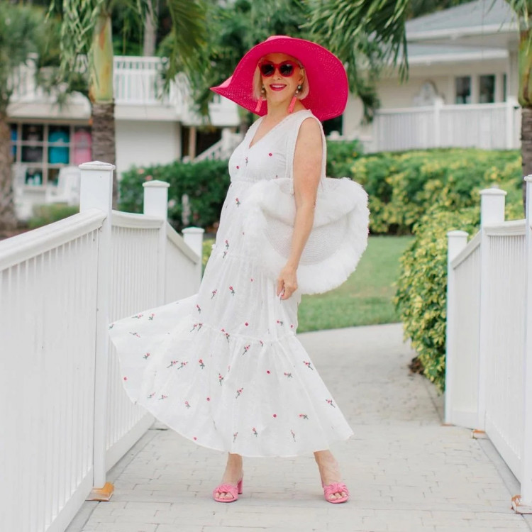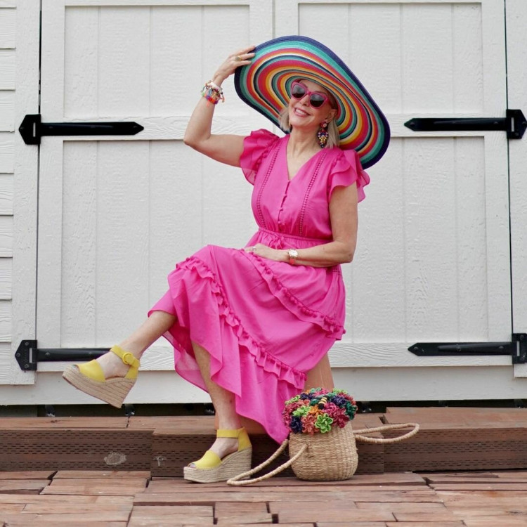 Рожевий колір має anti-age ефект, налаштовує на позитивний лад. Зупиніть свій вибір на сукні максі, зручних босоніжках і капелюсі в райдужну смужку.