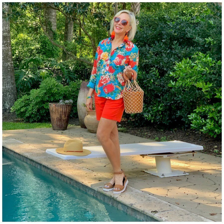 Щоб дійти до морського пляжу або басейну, з’єднайте в одному образі сорочку з виразним флористичним принтом і однотонні шорти морквяного кольору.